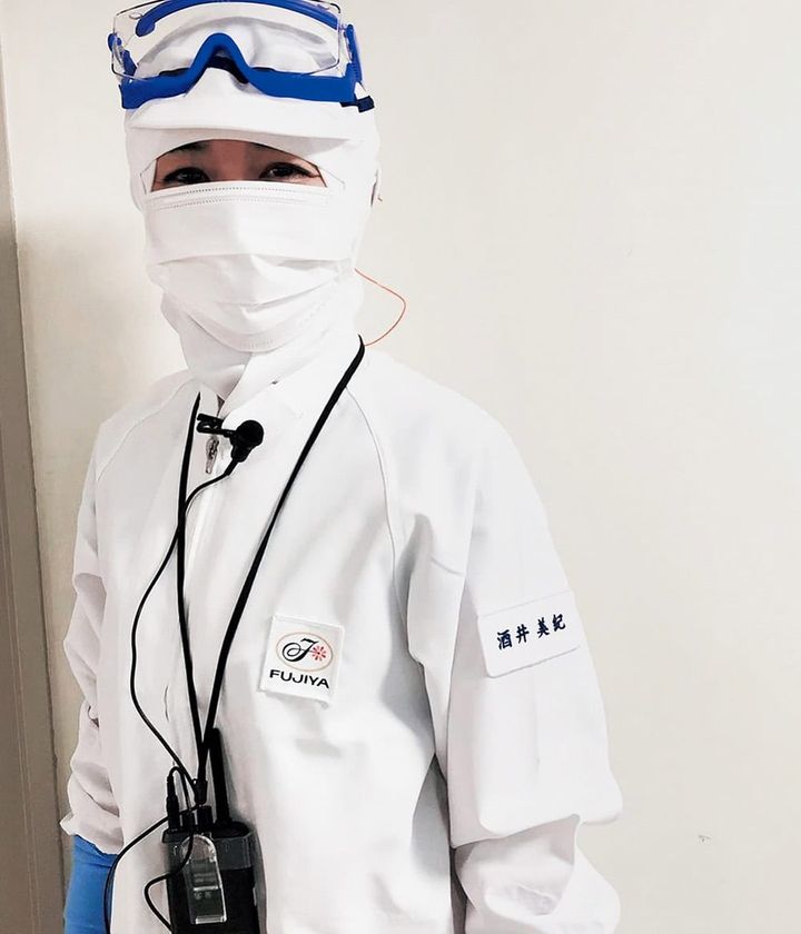 左袖に酒井美紀の刺繍入り食品衛生白衣で工場視察。