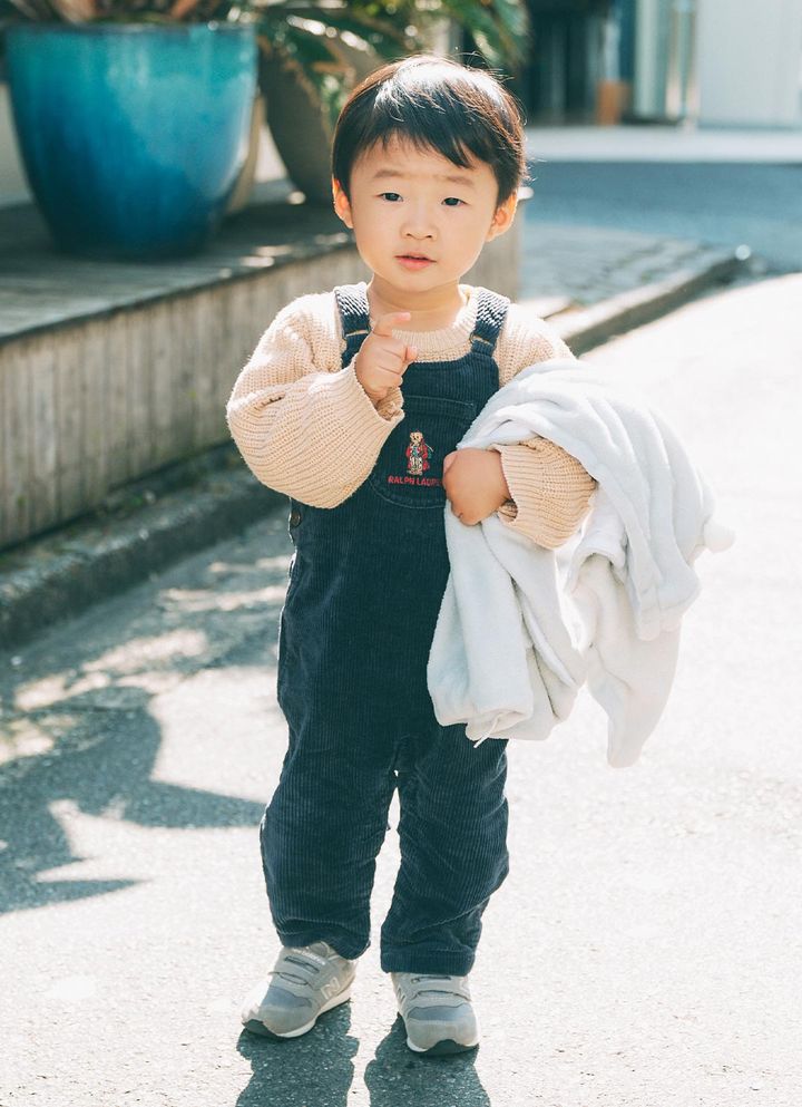 古着屋で見つけた『ラルフローレン』のサロペットが元気いっぱいのキッズにぴったり♪ ベージュのニットを合わせて、きちんと感もありつつ、ふわりとしたアウターで冬の防寒もバッチリ。