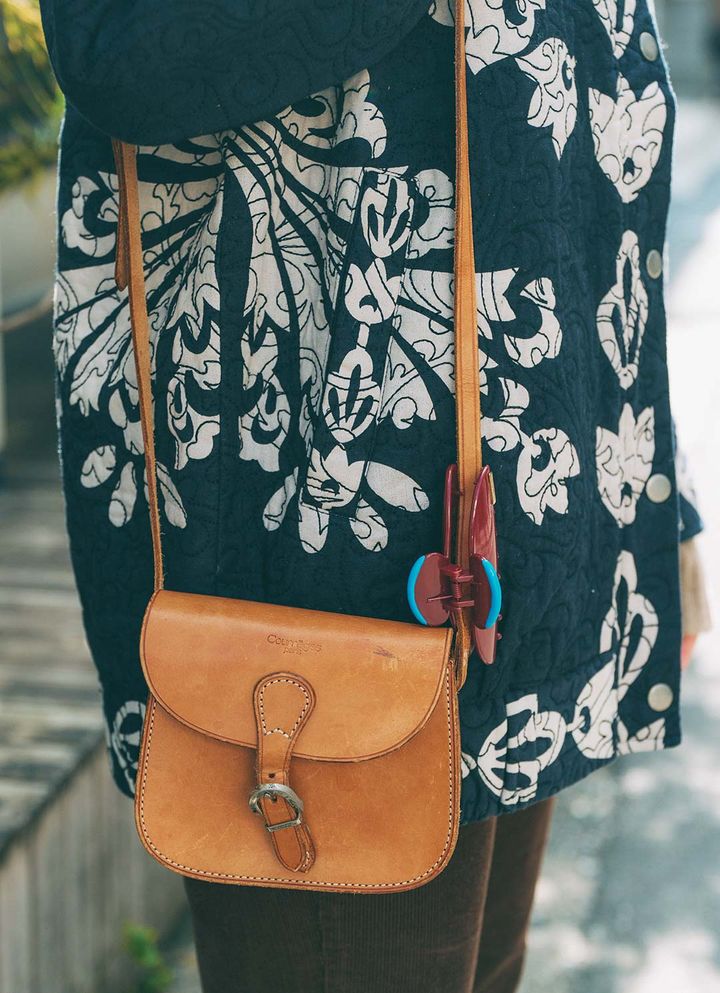 『クレージュ』のバッグはヴィンテージならではの色褪せ具合が堪らない! ポップなヘアクリップを挟んで、遊び心も忘れずに。