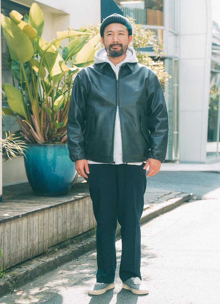 ブラックのニット帽を被ったパパの冬スタイル。レザーアウターの男っぽさを、程よく中和してくれるアイテム。