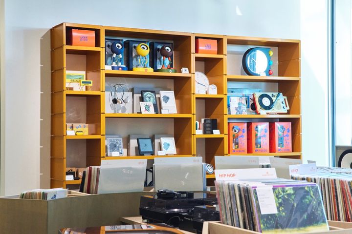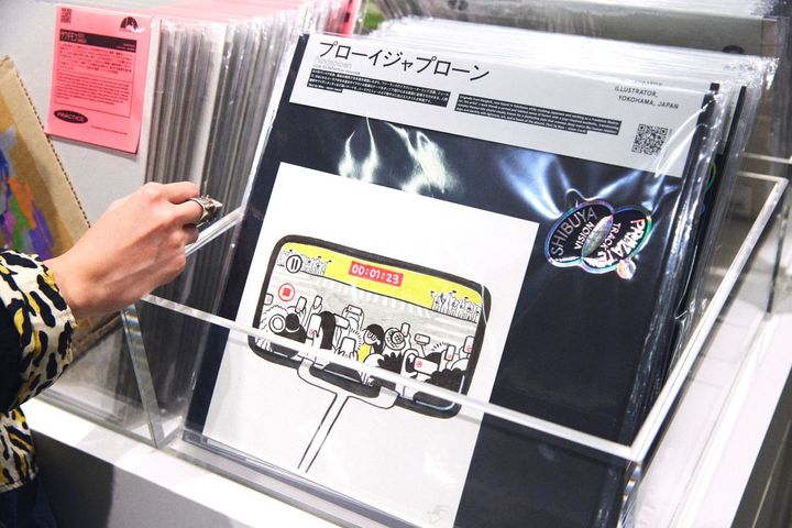 まず目に入るのが、エントランスをくぐってすぐのレコードボックス。そこには懐かしのヴァイナル盤……ではなく、国内外のイラストレーターやアート作家が手掛けた作品が、まるでレコードのように陳列されている。