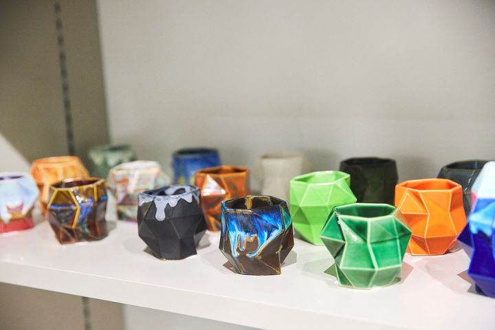 バーチャルろくろという特殊な機材を用いて生み出された未来的な造形と、温かみと優しさのある色合いの融合は唯一無二。小澤さんは「ギフトにもおすすめ!」と太鼓判を押す。