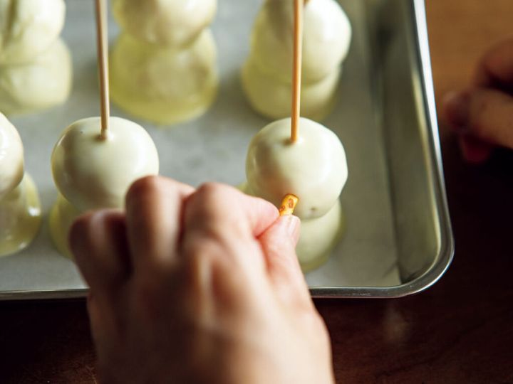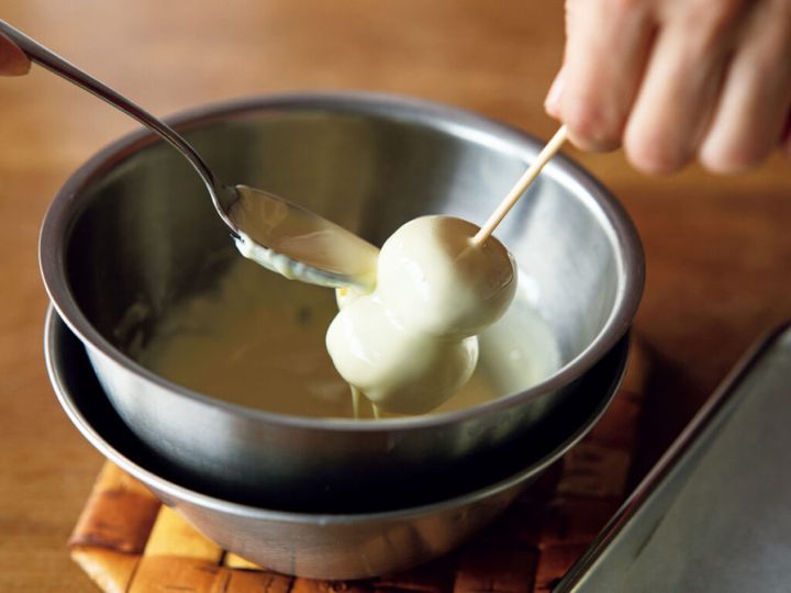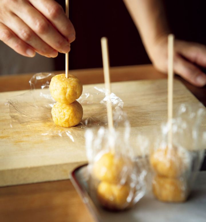 (3)生地を12等分(約20gずつ)にしてラップで包んで丸める。ラップを取り、表面にひびがあればなじませ、2個ずつ竹串に刺す。生地をかるく握って竹串と密着させてから、自立するよう指で形を整え、最後にグミをのせる頭の上も少し平らにする。それぞれラップでおおい、オーブン用シートを敷いたバットに並べ、冷蔵庫で30分以上冷やす。