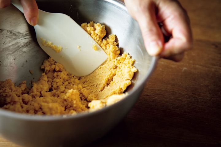 (2)(1)のボールにバウムクーヘンを3~4等分にちぎって入れ、ゴムべらで切るように混ぜる。バウムクーヘンが大きめのそぼろ状になったら、ボールの側面になすりつけるようにして、クリームチーズのかたまりがなくなるまでしっかり混ぜる。