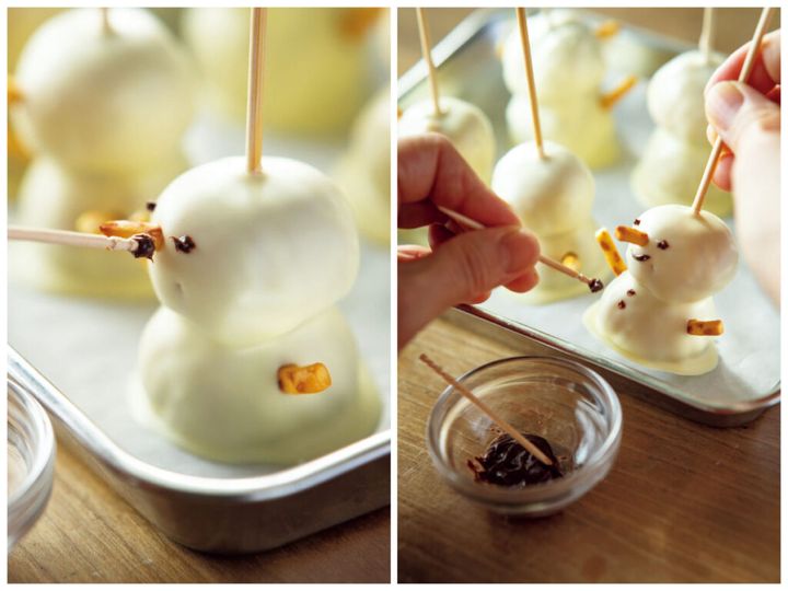 バットに並べなおし、チョコレートが完全に乾かないうちに、鼻と腕の部分に楊枝の持ち手側(とがっていないほう)で深さ5mmほどの穴をあけ、プレッツェルを差す。竹串を一周くるりと回し※、再び冷蔵庫で15分以上冷やす。