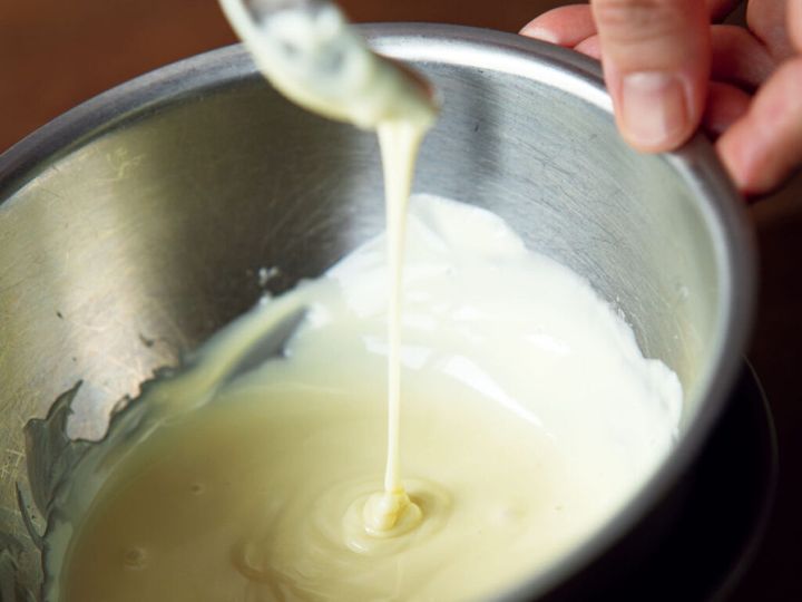 チョコレートが少し溶けてきたら※、スプーンでゆっくり混ぜる。スプーンですくって、さらりと流れ落ちるまで溶ければOK。