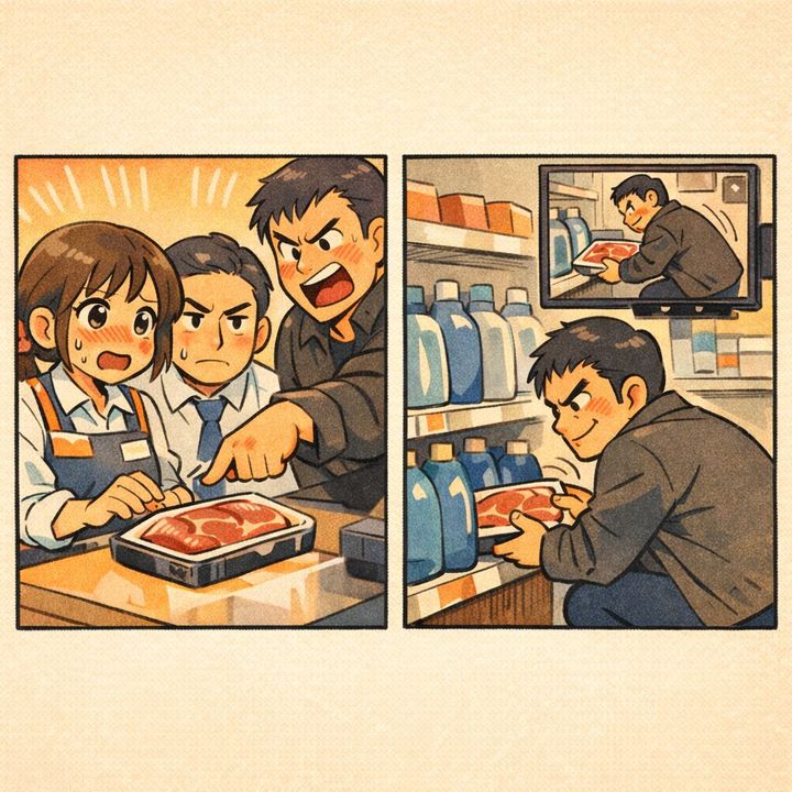 「お客様、カメラにはっきりと映っていましたよ。あなたが3時間前の昼下がりに来店し、このお肉を洗剤売り場の棚の奥に隠している姿が」