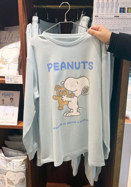 トップスの全面に大きくスヌーピーがプリントされた疲労回復ウェアは、淡いブルーの爽やかカラー!