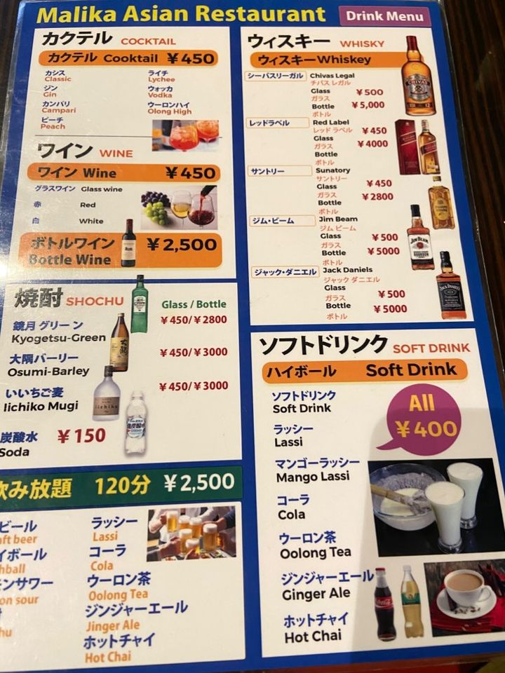 コロナビール・ネパールアイス・サッポロビール・角ハイボール・ラッシーサワー・ワイン・焼酎・ソフトドリンクなど、ドリンクメニューもとても豊富でした。飲み放題120分、2,500円です。