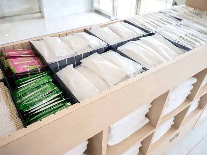 店舗1階のアメニティーコーナー内にある、歯ブラシやカミソリ、お茶などのアメニティーグッズは、宿泊時に必要な分のみお部屋へお持ちください。