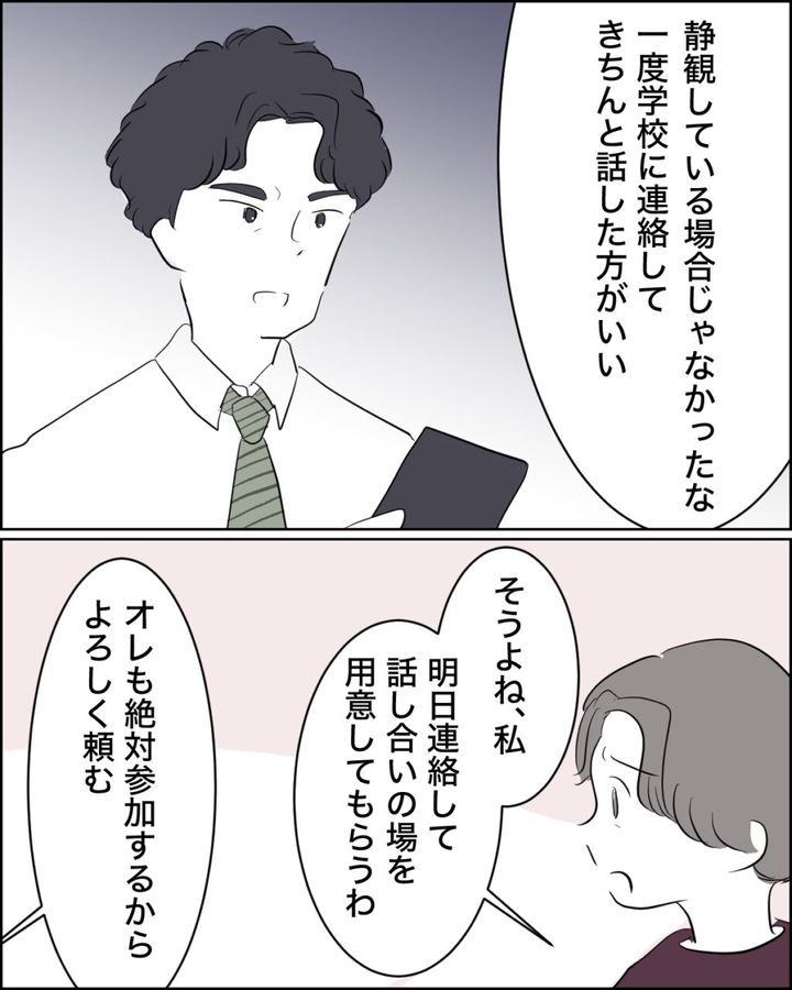事態を放っておけないと思った博之はスマホを手に取り、「静観している場合じゃなかったな、一度学校に連絡してきちんと話した方がいい」と言いました。私もその言葉に頷き「明日連絡して話し合いの場を用意してもらうわ」と応えます。博之は落ち着いていましたが、表情から怒りに震えているのがわかりました。