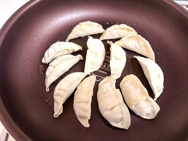 油をひいたフライパンに凍ったままの冷凍餃子を入れるだけ!焼き目がついたら、水かお湯を回しかけフタをして弱火で3~5分蒸し焼きにします。ジュワーッという音からパチパチ!と音が変わったらフタをとり焼き目をつけます。できあがるまで10分もかかりません。