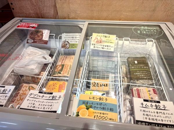 店内には大きな冷凍庫がドンと2つ置いてあります。国産キャベツたっぷり!甘みとシャキシャキ食感が魅力のプレーン(22個)の他、レモン(16個)、キムチ(18個)、スパイシーカレー(18個)、紫蘇れんこん(18個)、ハラペーニョ(18個)などバラエティ豊かで常時12~15種類、旬の食材を使った期間限定品もあります。餃子に合わせた特製タレ付きですべて1000円のシンプルな価格設定です。
