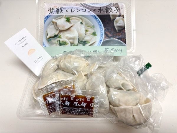 水餃子はプレーン(18個)、台湾火鍋(16個)、紫蘇れんこん(16個)などがあります。「紫蘇とレンコンの水餃子(16個)」も食べ方レシピつき。沸騰した鍋にそのまま入れて8分ほど茹でるだけの簡単調理。さわやかな紫蘇にれんこんのシャキシャキ食感、皮のもちもち食感がたまりません。かぼすぽん酢ダレで一層さわやかさ倍増。食欲が無いときでも食べられそうです。