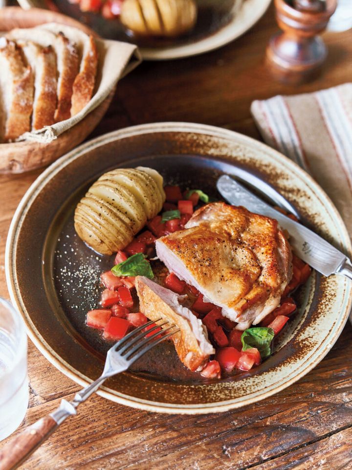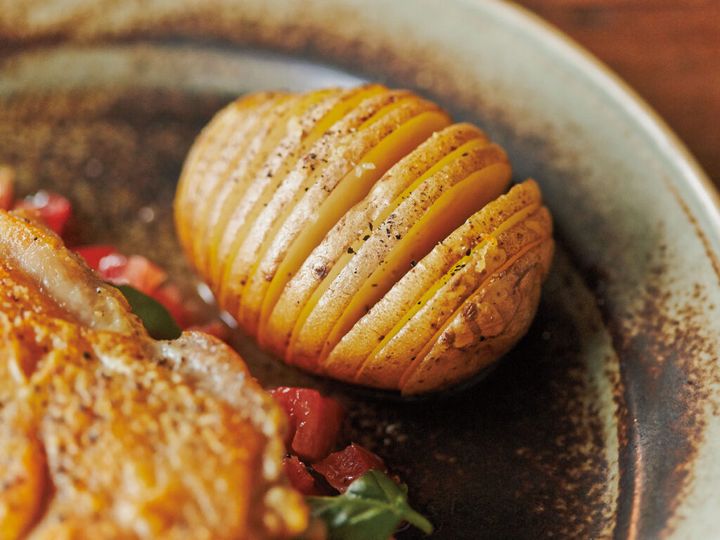 器に(1)のソースを1/4量ずつ広げ、鶏肉1枚をのせて、バジルをちぎって散らす。ハッセルバックポテトを添えて、粗びき黒こしょう少々をふる。