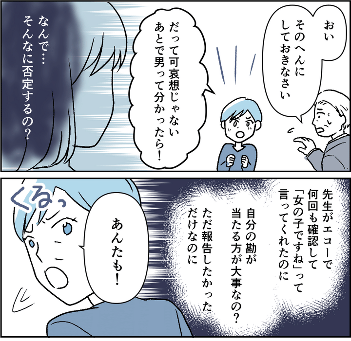 病院で確認して「女の子ですね」と言われたのに、母の自分の勘の方が大事だと言わんばかりの態度に、言葉にならないもどかしさを感じました。