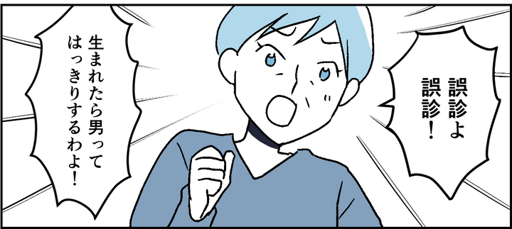 母は声を荒げて「誤診よ、誤診! 生まれたら男ってはっきりするわよ!」と言い、父が「おい、そのへんにしておきなさい」と母を制しました。しかし、母はなおも「だって可哀想じゃない、後で男ってわかったら!」と、続けました。