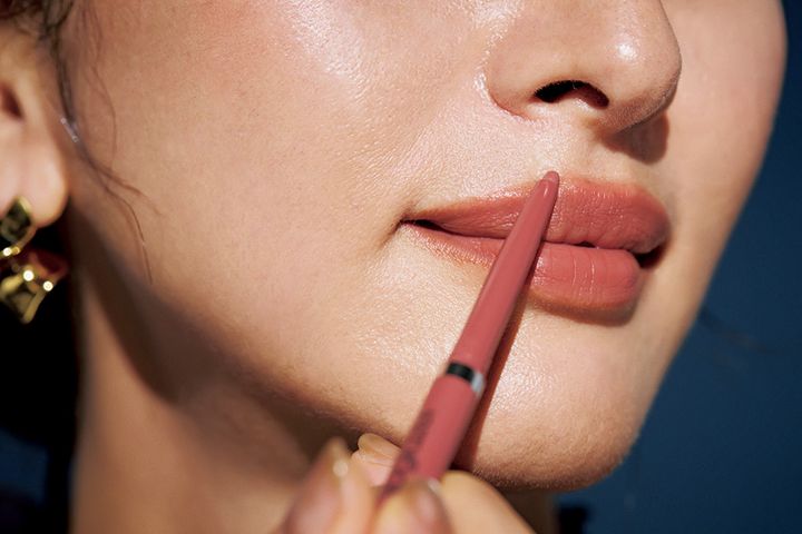 上唇をオーバー気味に描くと、人中短縮になって顔が引き締まった印象に。唇全体をライナーで埋めたあとリップを塗り、ふちをなじませて。飲んでも食べても落ちにくいブラウンリップをキープ。