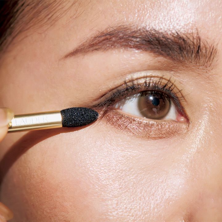 上瞼はシンプルにパレット左下を全体に。下瞼に左上と右上、目頭にも右上で輝きを。下瞼メイクで印象が締まり、目が自然に大きく。好みで右下をプラス。