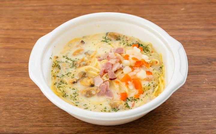本商品は、あさりや野菜の旨みが溶け込んだクラムチャウダースープにパスタを合わせたものです。