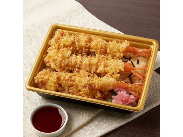 大海老を3本盛り付けた、ボリューム感のある大海老天重です。タレはかつおやごま油の風味の良いタレです。
