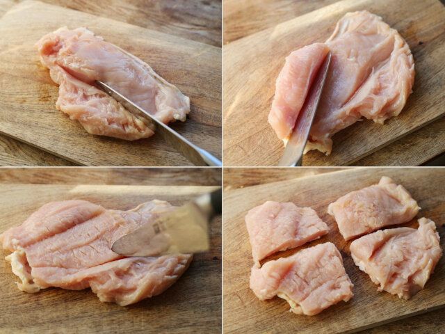 ① 鶏むね肉は、中央付近の繊維の向きが交わる部分に、包丁で切れ込みを入れて厚みが均等になるよう開く。反対側の厚い部分も、切れ込みを入れて薄くする。