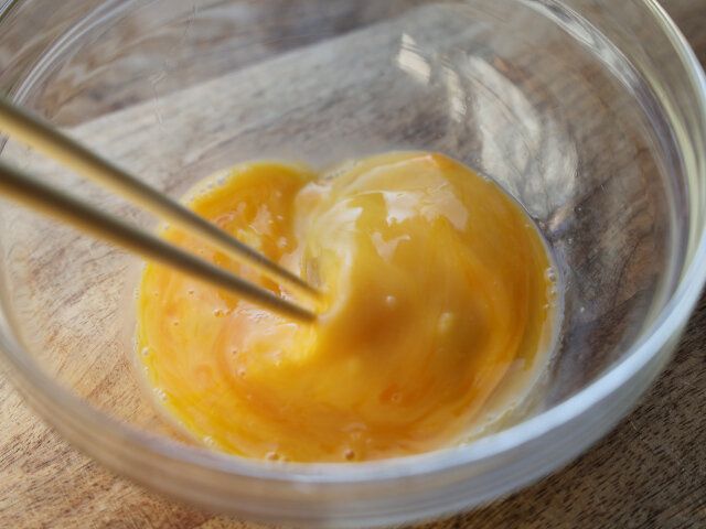 ④ ボウルに卵を溶き、半分を③に入れ、半分はそのまま残しておく。(漬け込み用と後付けの衣に使用します。)