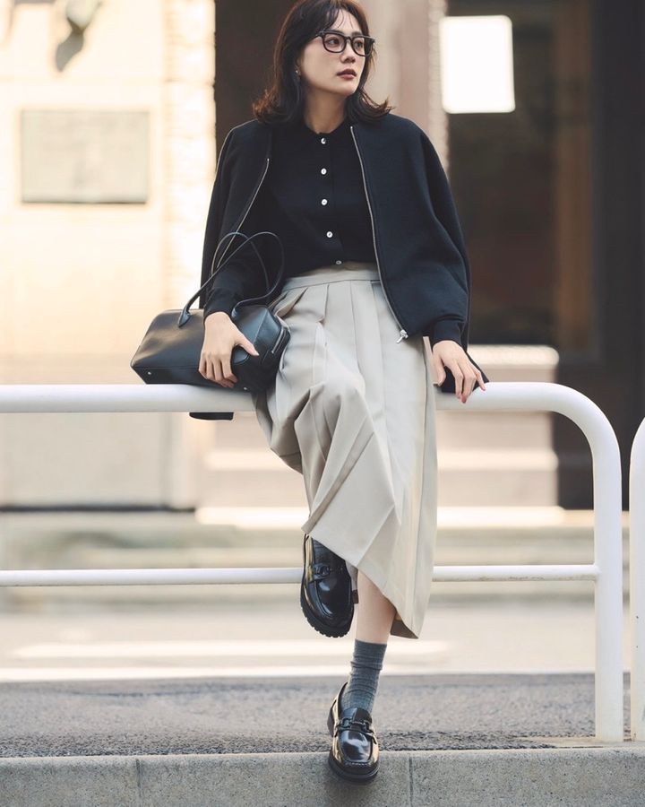 12月22日(月)、カーディガン×プリーツスカートの王道トラッドスタイルには、マニッシュな黒ローファーを合わせて程よくハンサムに。かっちりとした黒レザーバッグやメガネで“かっこよさ”を足すことで、甘さ控えめの大人バランスが完成します。仕上げに黒のショート丈コートを羽織れば、真面目すぎない今どき感が生まれ、ワントーンコーデにも自然な奥行きが。週の始まりにちょうどいい、きれいめ通勤スタイルです。
