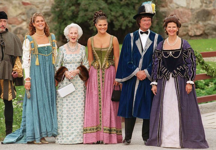 写真は、2001年6月18日、結婚25周年を記念した祝賀ディナーでのもの。カール16世グスタフ国王ほか、皆が仮装して登場した。
