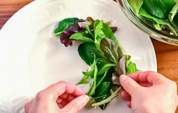 ベビーリーフを皿に円を描くように並べていきます。ちなみに筆者は直径27cmの皿を使いました。