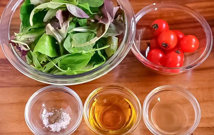 ベビーリーフとミニトマトだけのサラダでも、盛りつけを工夫しただけで気分が高まりますね。