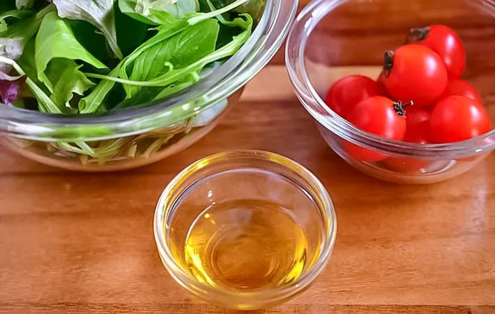 今回のサラダにはオリーブオイルを使ったドレッシングを使いました。