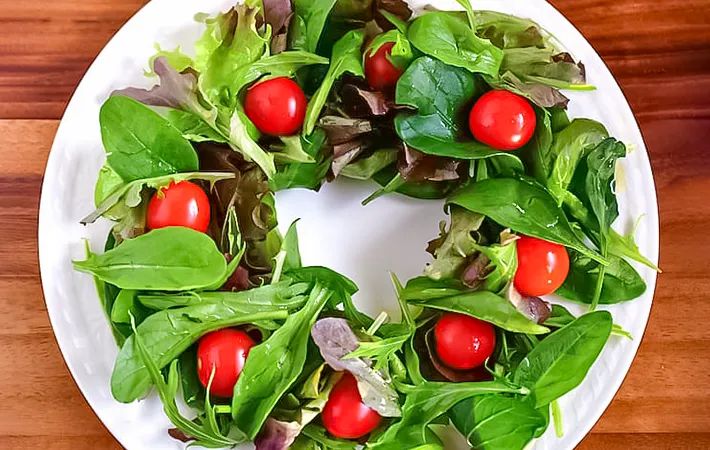 赤と緑のクリスマスカラーで、かわいいリースの形のサラダ。