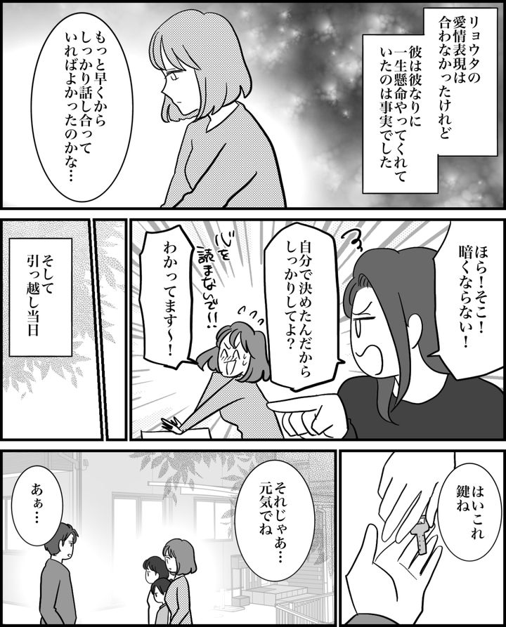 そして私たちが家を出て行く日。最後に家の鍵をリョウタに渡して、挨拶をしました。子どもたちも何か言いたそうにしています。先に口を開いたのはユウナでした。「お父さん……。ごめんなさい……」その後、アオイも続きます。