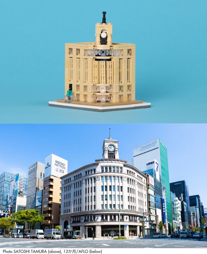 <写真>上から、レゴでつくったセイコーハウス。銀座四丁目交差点に立つセイコーハウス。