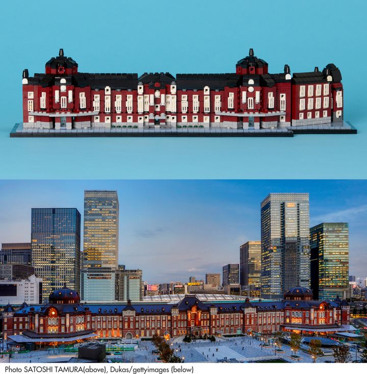 <写真>上から、レゴでつくった東京駅と実際の東京駅。辰野金吾が設計した東京駅は1914年竣工。第2次世界大戦でドームなどを焼失、2012年に創建時の姿に復元された。