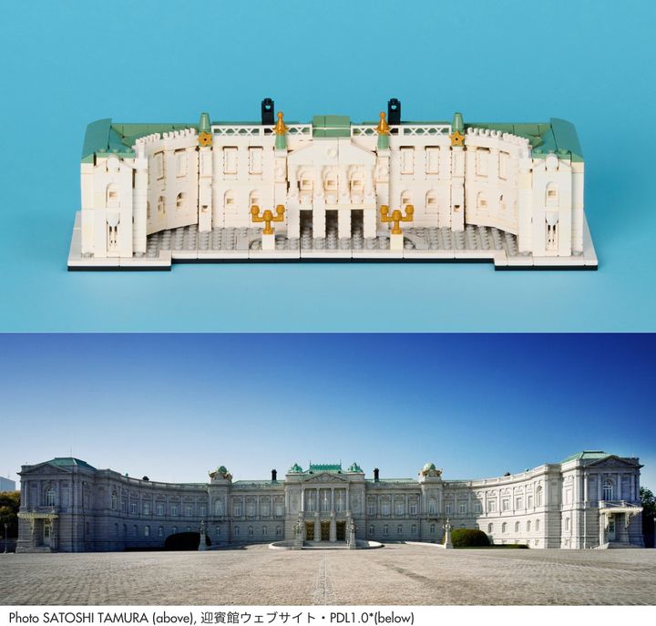 迎賓館赤坂離宮は、東宮御所として1909年に建設された。片山東熊が設計したネオ・バロック様式による宮殿建築。デコラティブでつくっていて楽しいタイプの建築とokkaさん。「レゴなんですが、もう建物を建てているような気分になってきます」。装飾の部分を工夫しつつ、建物の曲線をうまく出していった。