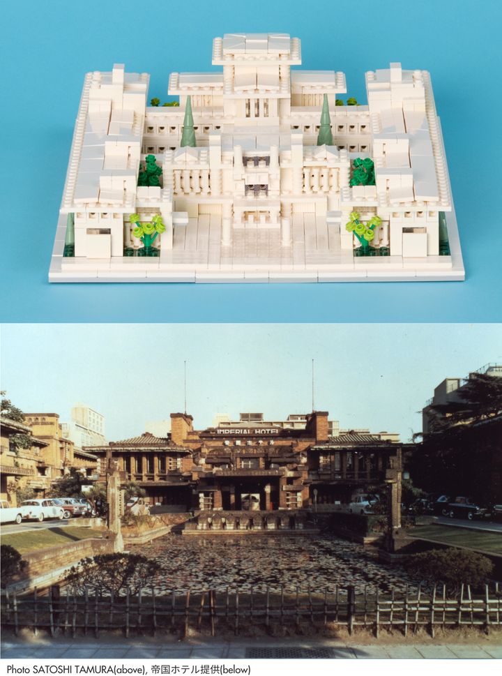 <写真>上から、レゴでつくったフランク・ロイド・ライト設計の旧帝国ホテルと、旧帝国ホテルが現存していた頃の写真。okkaさんは玄関前の水盤から取り掛かり、バランスを決めていった。