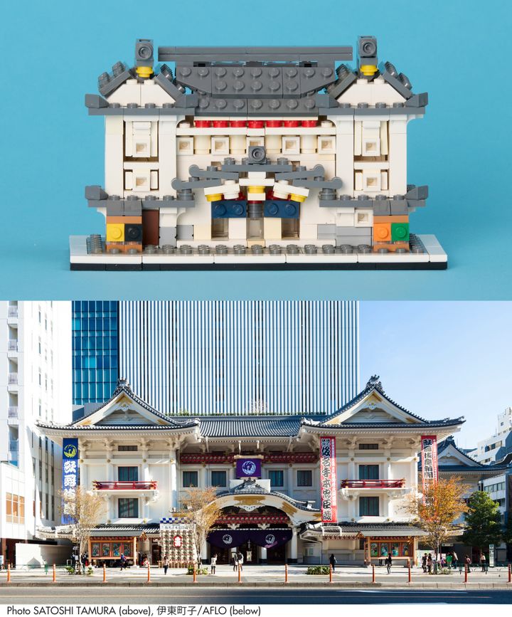 銀座の歌舞伎座も、屋根の意匠などレゴでの再現が難しかった作品の一つ。現在の歌舞伎座は、第5期(2013年築、三菱地所設計、隈研吾建築都市設計事務所による共同設計)で、戦後、第3期(1924年築、岡田信一郎設計)の建物を踏襲して建設された第4期(1950年築、吉田五十八設計)の外観を再現して建替えられている。破風(はふ)など伝統建築の華やかな造形をレゴで組み立てるのは楽しいとokkaさん。