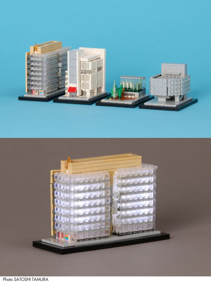 建物を並べて眺められるのもレゴ建築の良いところ。例えば銀座・数寄屋橋交差点のランドマーク、1966年築のソニービルから、2018~2021年の建て替え中、2025年に完成した銀座ソニーパークまで、ソニーの歴代の建物を並べ、その隣に2001年築の銀座メゾンエルメスを置くと、街並みの移り変わりが目に浮かんでくる。