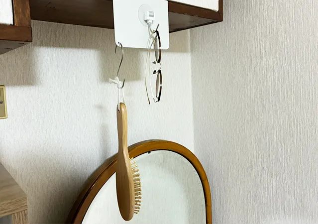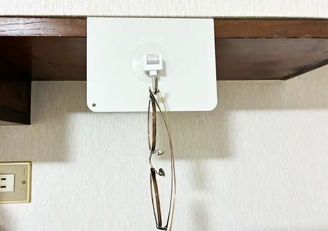 小物の収納に使うアイテムが、ブックエンドと吸盤でくっつくタイプのフック