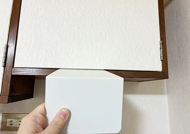 まず、戸棚のすき間にブックエンドを差し込んでください。