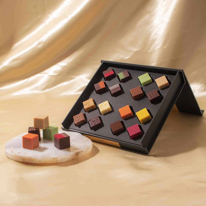 食べやすい一口サイズが並んだ見た目も楽しめるアソート。キューブ型のボンボンショコラは、全16種。ナッツ、フルーツ、ティー、リキュールなどいろいろなフレーバーのチョコレートをその時の気分で選ぶのも楽しみに。 洗練されたデザインは、大切な方への贈り物や、みんなで食べる時間にもぴったりです。