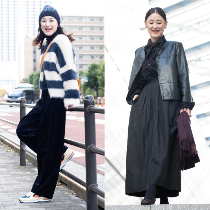 「ボウタイはブラウスのセットではなく、リボンは自分で手作りしてアレンジしています。色を統一するとさりげないアクセントになりますね」(川野さん)。黒は黒でもシャギージャガード素材のブラウスやレザージャケットなど異素材なアイテムを合わせるだけで、着こなしが上級者見えします!