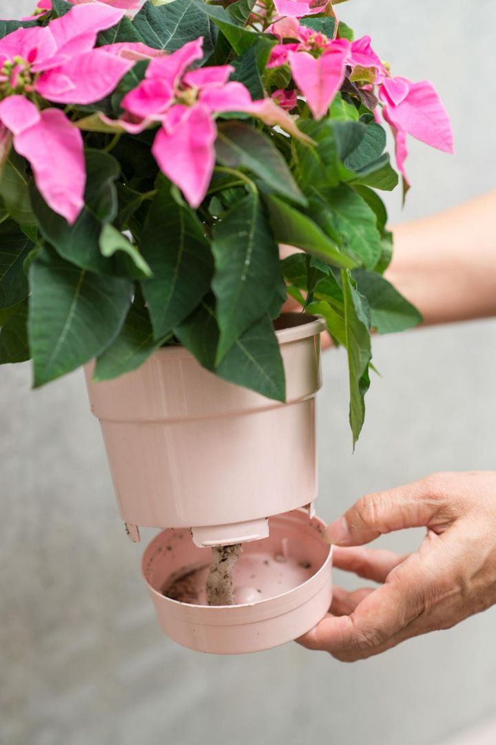 鉢底の器に水を溜めて吸水させる「底面給水鉢」で販売されることが多いポインセチアや大型のシクラメン。