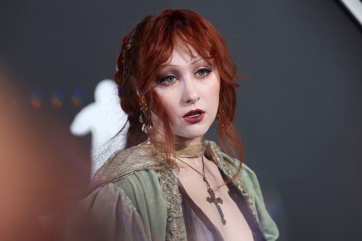 こちらも2024年のVMAsより。陶器のような肌に、ゴールドのラメをふんだんに使ったアイメイク、極細に整えられた眉と、陰影が際立つダークカラーのリップは、チャペルの大胆でちょっぴりダークな世界観を完璧に表現しています。