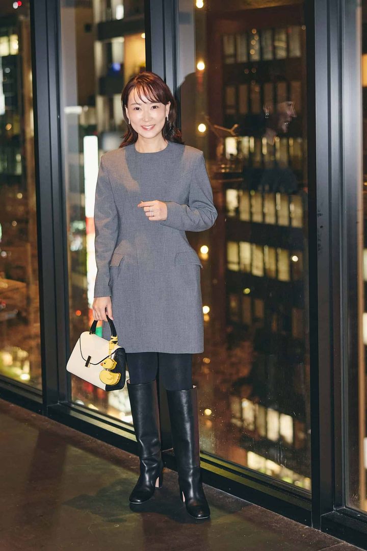 立体的なシルエットが際立つグレーのミニワンピースを主役に、ロングブーツでモードなバランスに。ウエストがほどよくシェイプされ、腰位置が高く見えるからスタイルアップ効果も◎ ジャケットライクなフラップポケットがアクセントになり、きちんと感と今っぽさを演出。バッグのチャームでさりげない遊び心をプラスして、モードなエレガンススタイルに仕上げました。