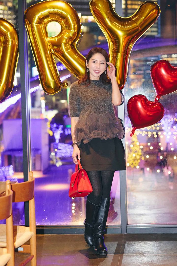 STORY の忘年会は毎年司会を担当しているので、華やかさを意識していますが、12月に入ると撮影やイベントが多く、着る服が無くなって困ることも。ダブスタのニットはラメの輝きやチュールのデザインで、一枚で華やか見えするのでこの時期に大活躍。全身は落ち着いたトーンでまとめつつ、クリスマスプレゼントで購入したヴァレクストラのバッグの赤で色をプラスしました。