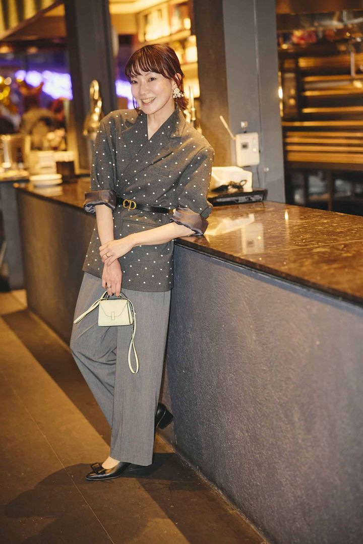 普段から愛用しているパールジャケットを、ベルトでウエストマークしてパーティー仕様にアレンジしました。ジャケットとグレーで合わせたワイドパンツは UNIQLO。ジャケットもパンツも普段使いできるアイテムですが、ベルトやバッグ、靴などの小物はカッチリしたものを合わせてマニッシュなパーティーコーデに仕上げました。アクセサリーは耳元に華やかでインパクトがあるピアスを選んだので、潔くネックレスはつけずに引き算を。