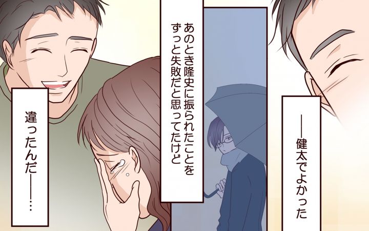 健太と結婚できてよかったー。隆史に振られたことをずっとずっと失敗だと思っていましたが…、違ったのです。健太のおかげで黒い過去も昇華でき、ホッとしたのか泣けてきました。
